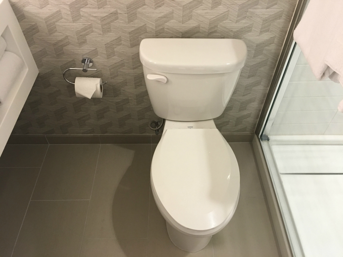 Connected to the backside of the bedroom is a small hallway closet that leads into the suite’s only bathroom. It includes dual sinks, a large shower, and a commode.